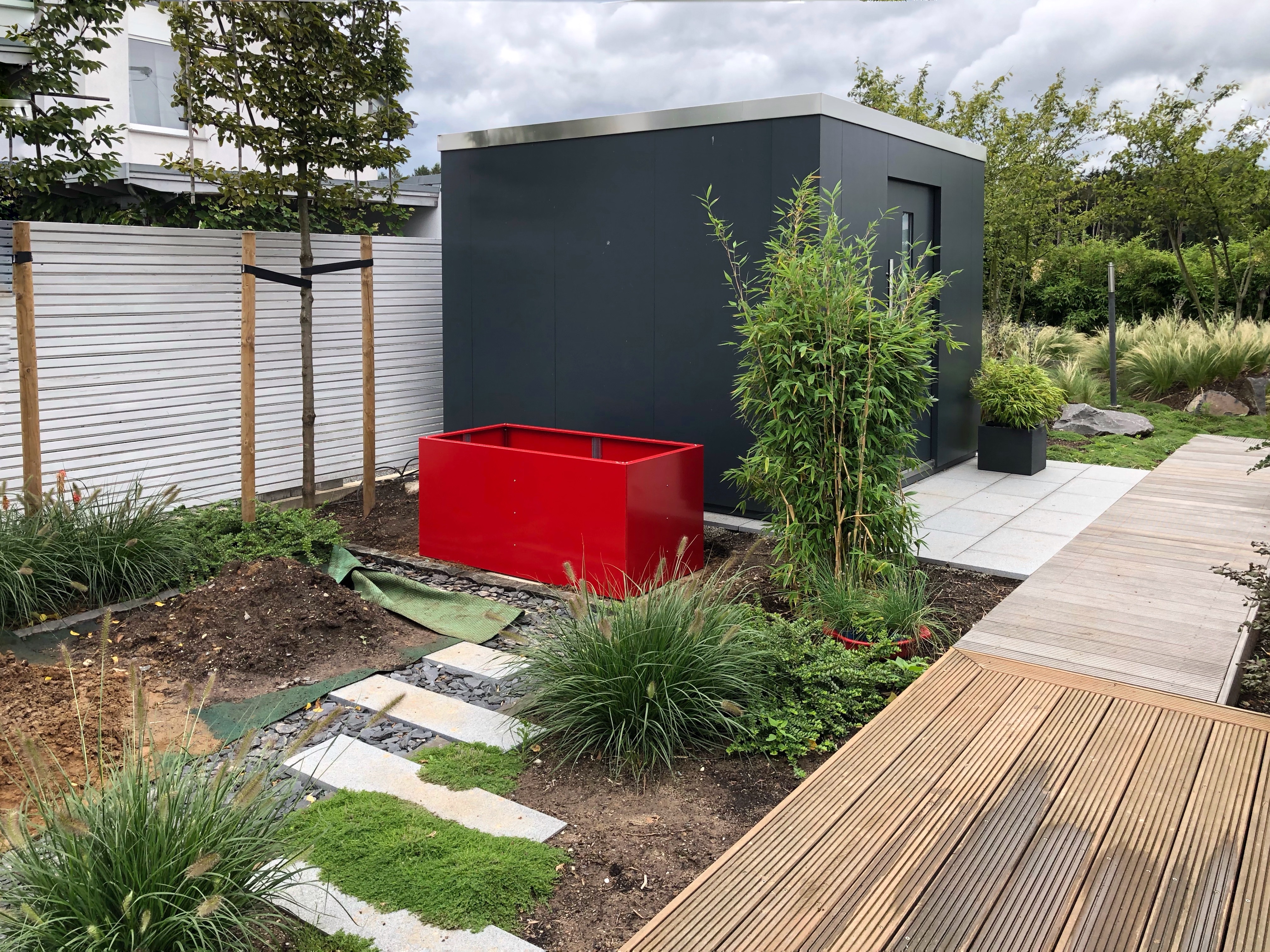 Angefangen hat es natürlich mit der Auswahl des Herstellers – gefühlt hunderte Tabs im Browser mit verschiedenen Herstellern, Farben, Formen, Materialen und Preisen. Dann die nächste Entscheidung: die Größe. Alles im Garten direkt „vor Ort“ ausgemessen, simuliert und abgewogen. Farbe! Ohje – FARBE 😳. Nach langer Beratung und Arbeitskreis das Ergebnis: ROT soll es sein.