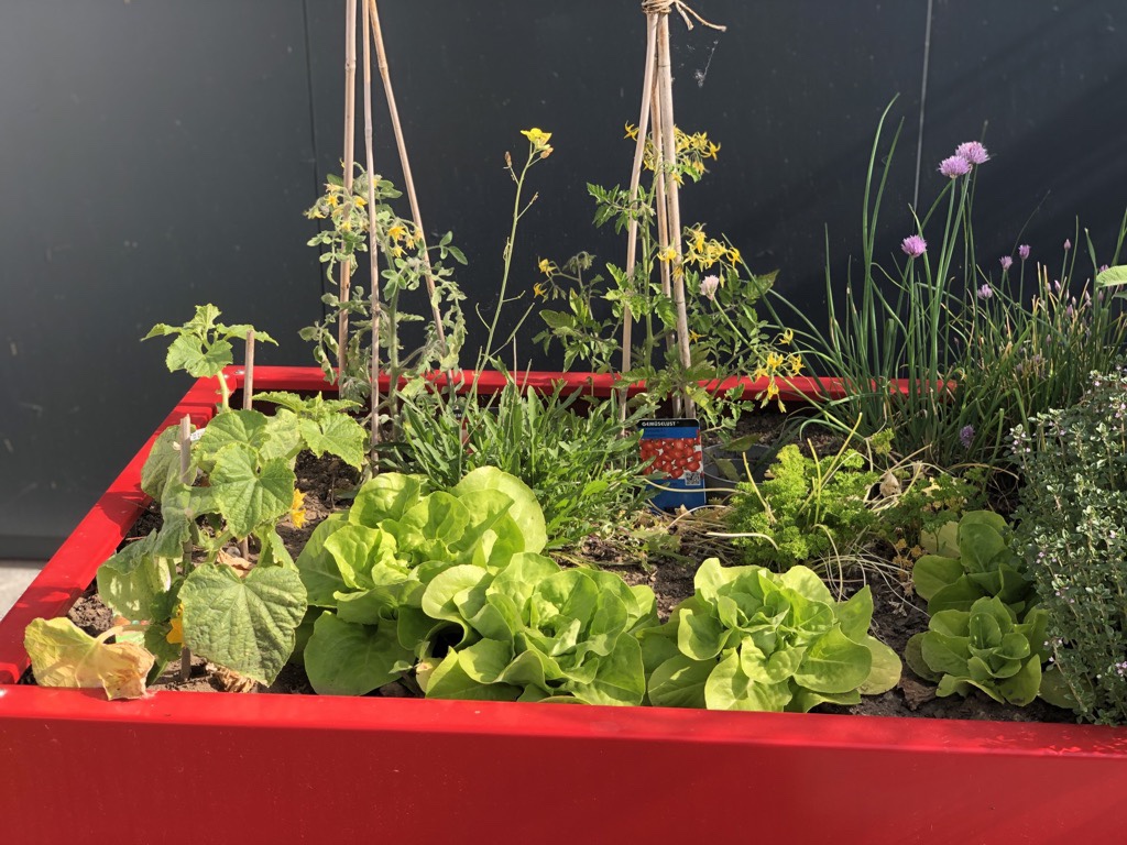 Noch im Frühling karg und leer, wachsen nun Tomätchen, Gürkchen, Rucola und Kopfsalat neben einem Kräuter-Allerlei.