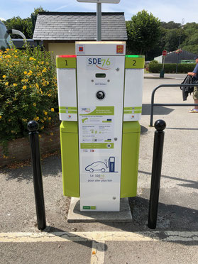 Man trifft relativ oft auf Ladesäulen auf z.B. Parkplätzen – meistens aber nur eine Säule mit 2 Ladepunkten. Manchmal war ein Ladepunkt auch defekt. Das hat uns schon etwas erstaunt, da man E-Autos in Frankreich noch viel seltener sieht, als schon in Deutschland. Ab und zu, echt selten, mal eine Renault Zoe. Die ist aber auch so hässlich, dass man die schon von weitem überall erkennt 😊.
