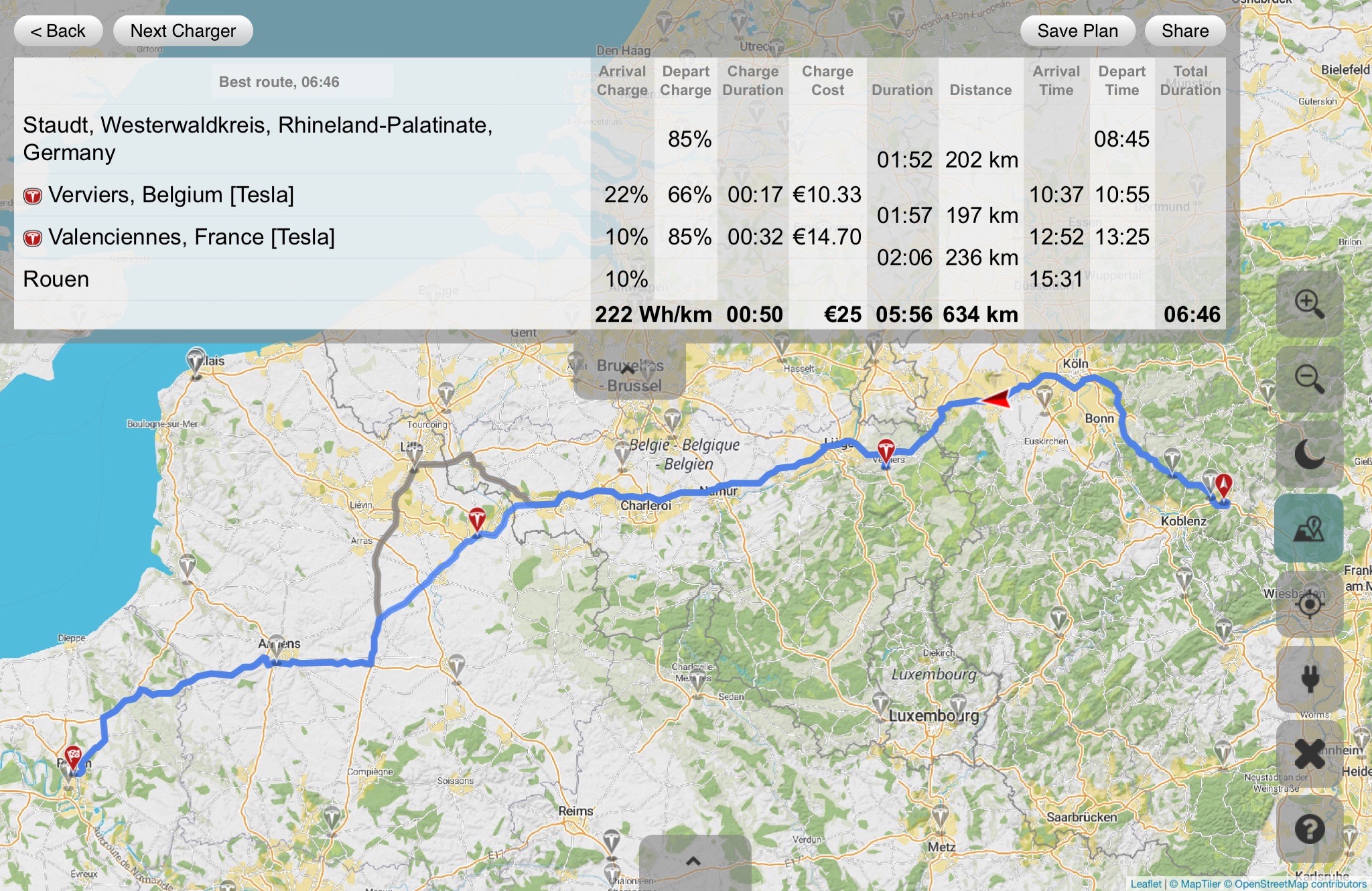 Wir haben uns für die nördliche Fahrtroute entschieden: Über Köln, an Aachen vorbei und durch Belgien nach Frankreich. Wir hatten für die Strecke nach Rouen zwei Tesla Supercharger Standorte rausgesucht, an denen wir laden wollten. Letztlich haben wir den ersten Stopp in Verviers (Belgien) dann einfach übersprungen, weil wir auch so bis Valenciennes gekommen sind. Also einfach nur ein Fahrerwechsel. Nähe Rouen gibts sowieso auch noch einen Supercharger Standort.