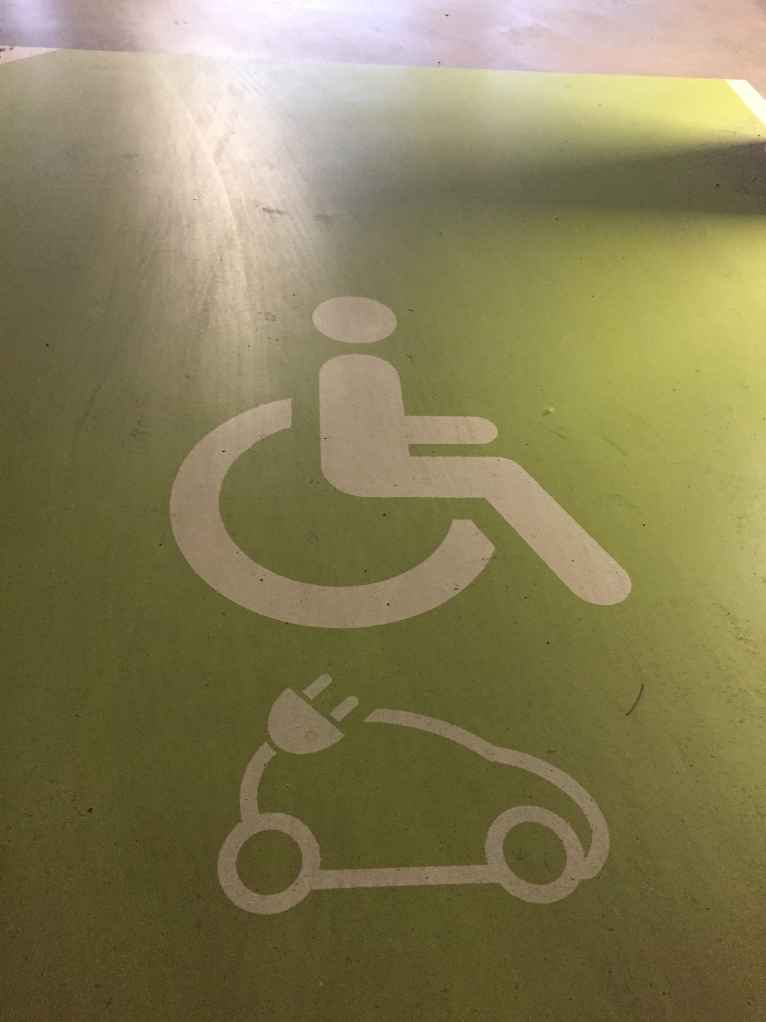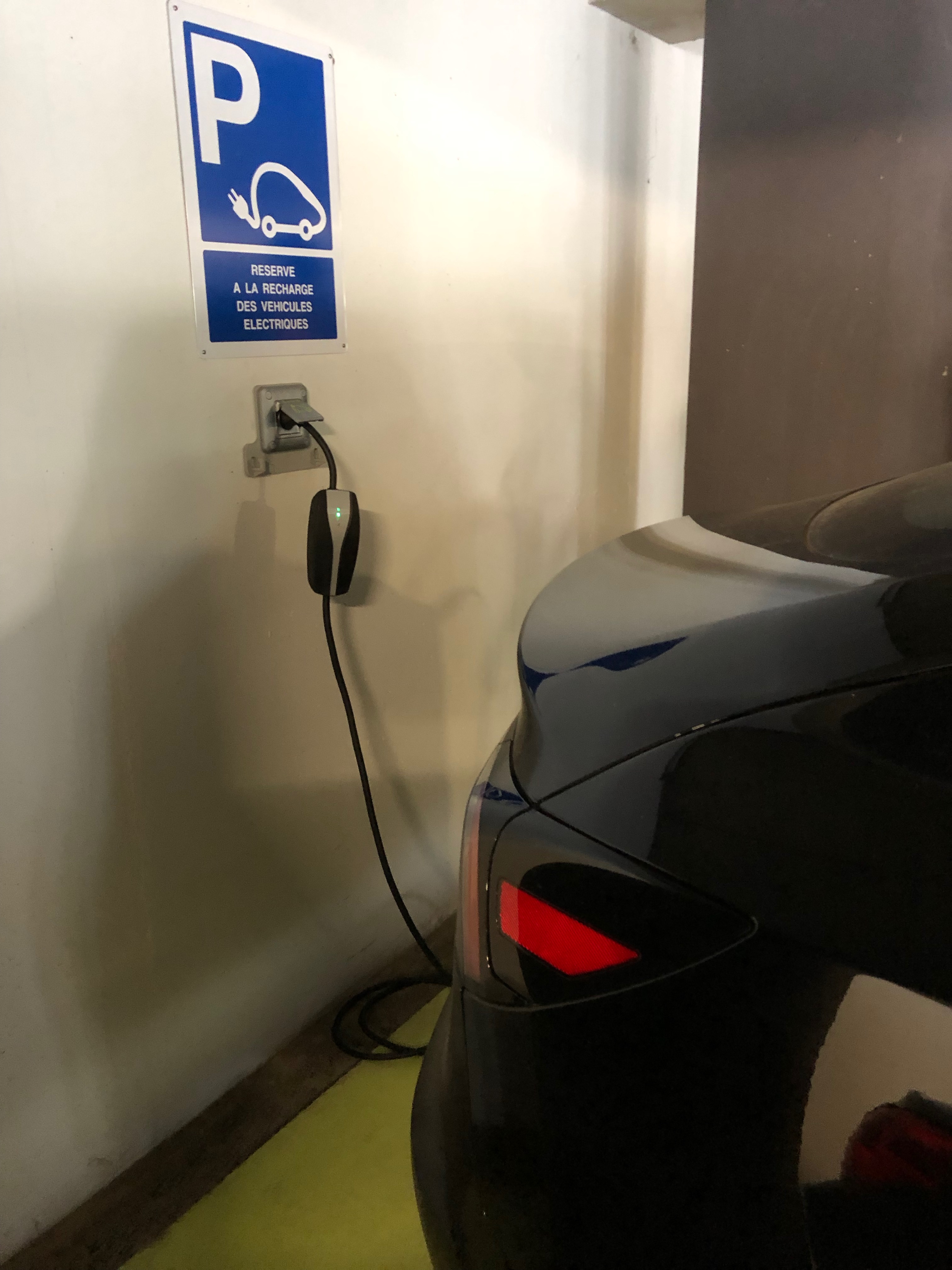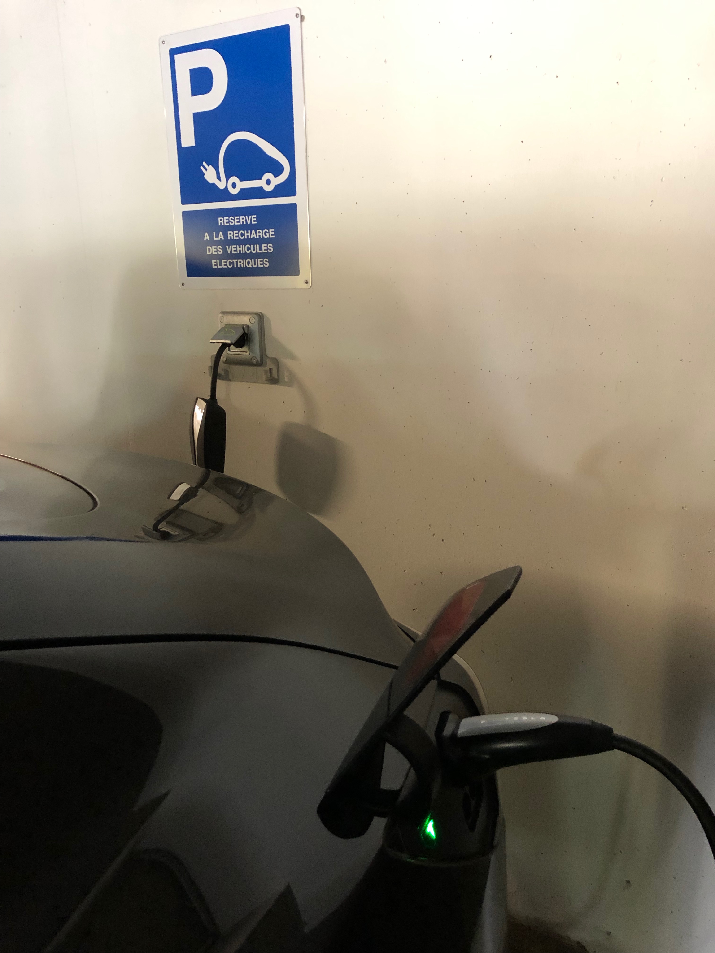 Wir sind dann aber aus Zufall in das öffentliche Parkhaus der Stadt geraten – Parken kostenlos und zusätzlich auch noch eine Reihe von kostenlosen Euro-Steckdosen! Sprich da kommen ganze 3 kW raus, aber was Solls: über Nacht ist die Kiste trotzdem voll und wenns kostenlos ist – wer würde sich da beschweren 😂 Übrigens sind die Franzosen mindestens genauso korrekt wie die Deutschen was besondere Berechtigungen betrifft: In der Garage gibts es nämlich einen Parkplatz für Elektroautos mit beeinträchtigten Fahren – sowas hab ich in Deutschland noch nicht gesehen! 😳