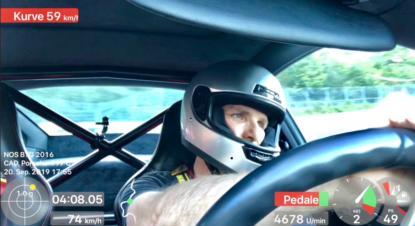 Dafür habe ich das Erste mal nicht nur mit der Sony Action-Com die Strecke gefilmt, sondern mit dem iPhone über die App „Harry’s Laptimer“ (Link zur IOS-App) gleichzeitig auch den Innenraum 👍, also den Fahrer – sprich mich 😊.