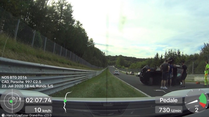 Es gab glücklicherweise bei der Anfahrt aufs Brünnchen gelbe Flaggen, sonst wäre bestimmt noch mehr passiert – das hätte echt ins Auge gehen können 😲. Eine Reihe Leute hatten rechts und links hinter dem Unfall gehalten und liefen auf der Strecke rum und waren auch um die Insassen bemüht. Das ist ein sehr zwei-schneidiges Schwert: Natürlich will man helfen. Aber man bringt sich und auch andere unter Umständen zusätzlich in Gefahr. Wenn ein schneller Wagen die gelben Fragen nicht gesehen hätte, wäre er genau in das verunglückte Fahrzeug gerauscht – bzw. in die Helfer, die vor dem Wagen standen! Er hätte auch kaum ausweichen können, da auf dem Randstreifen weitere Wagen standen … Wirklich keine gute Idee. Ich weiss es auch nicht, aber ich glaube, besser als die Strecke noch weiter zuzustellen ist es, zügig weiter zu fahren, nicht im Weg stehend nicht auf der Strecke rumlaufen ….😟