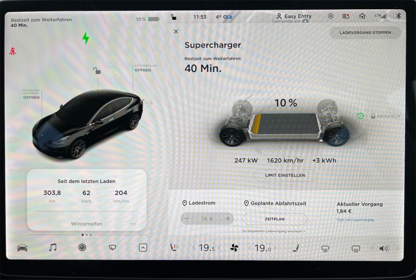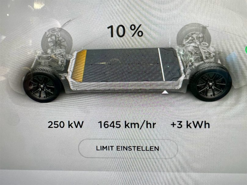 Wir haben die Stopps so gelegt, dass wir mit maximal 10% Restkapazität an den Ladesäulen angekommen sind – je niedriger die Ladung, desto höher (und damit schneller) ist die Ladeleistung. Ich hatte das erste mal die Gelegenheit, einen der schnelleren V3 Supercharger zu nutzen. Das ist dann echt beeindruckend: Die maximale Ladeleistung von 250 kW liegt zwar nur bei niedrigem Akkustand an und fällt dann kontinuierlich ab (das ist beim Porsche Taycan wohl anderes, also besser), aber dann würde man bei gleichbleibender Ladeleistung über 1.600 Kilometer Reichweite „aufnehmen“ können 😳👍. Wenn man, wie gesagt, mit max. 10% Restkapazität ankommt, reicht damit eine gängige Pause mit einem Gang zum WC in einer Raststätte aus, um anschließend entspannt weiterzufahren 😉.