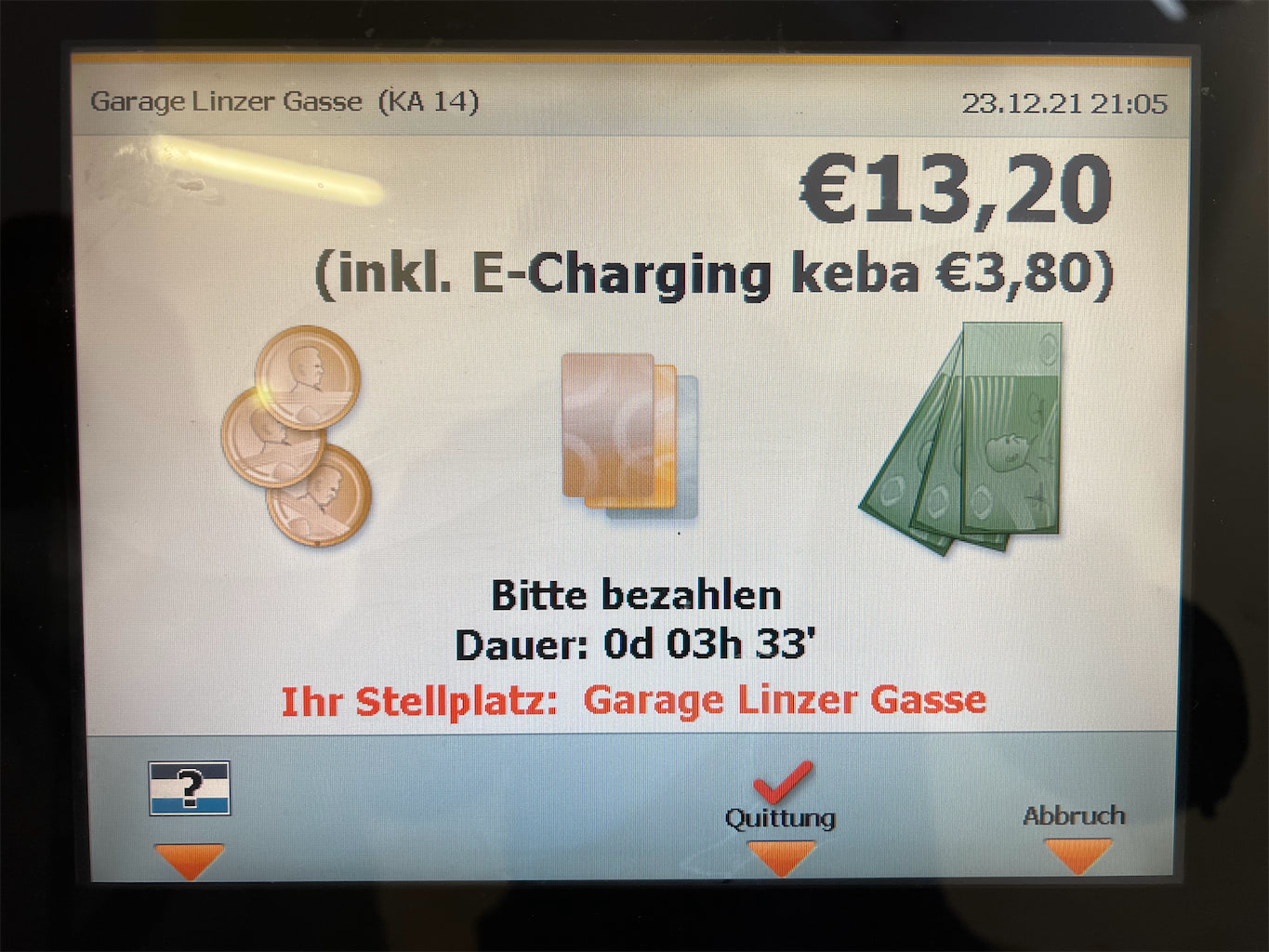 Wir haben etwas Zeit benötigt, bis wir (genauer Julika) herausgefunden hatten, wie das mit dem Bezahlen funktionieren sollte – und zwar denkbar einfach! Zum Freischalten der Ladesäule scannt man einfach den Barcode des Parktickets, welches man bei der Einfahrt gezogen hat. Die Ladegebühr wird dann entsprechend auf die Parkgebühr aufgeschlagen (bei uns 3,80 €). Super einfaches Abrechnungsmodell – ganz ohne Ladekarten & Co 👍.